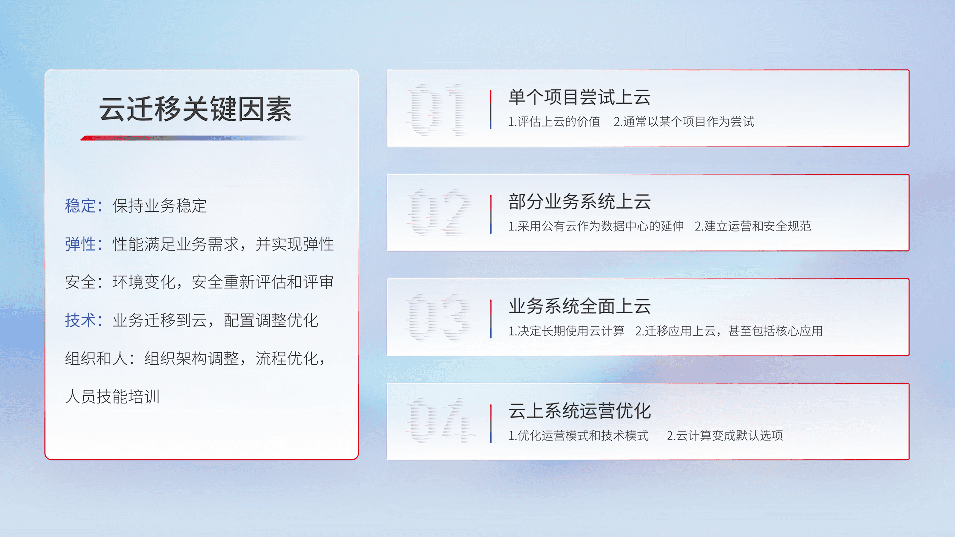 结合实际业务,,,,从规划设计、、云平台选型、、、、云原生改造、、数据迁移、、集成交付,,,迁移全过程为客户识别最佳上云路径,,,,做好风险识别管理,,,设计网络架构、、、、身份权限、、、安全审计合规、、、操作审计、、、日志审计、、、监控告警策略、、、、多站点容灾设计等,,对云上基础设施进行整体规划,,,,提升IT治理水平,,,以满足弹性、、、、高可用、、、高性能的需求。。。